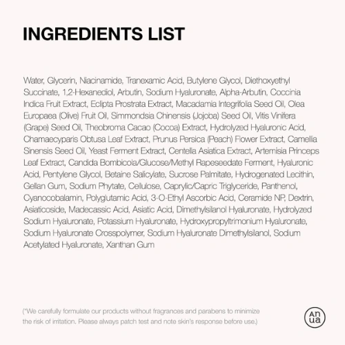 • Active Ingredients: 10% Niacinamide, 4% Tranexamic Acid, 2% Arbutin, Hyaluronic Acid, Ceramide NP, Centella Asiatica.