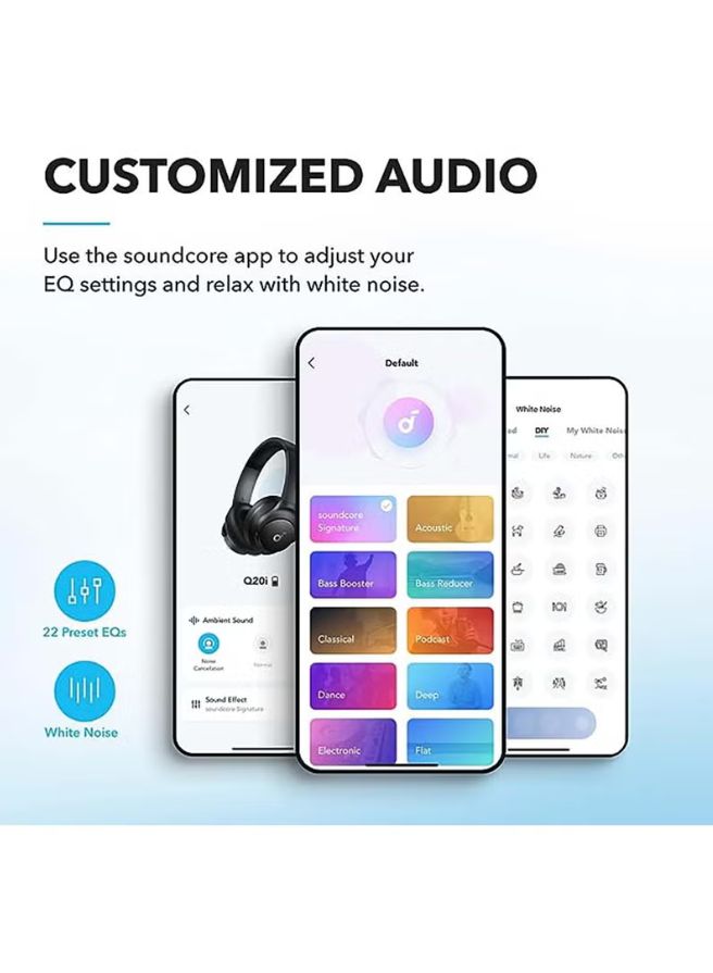 - App for EQ customization: Download the soundcore app to tailor your sound using the customizable EQ, with 22 presets, or adjust it yourself. You can also switch between 3 modes: ANC, normal, and transparency, and relax with white noise