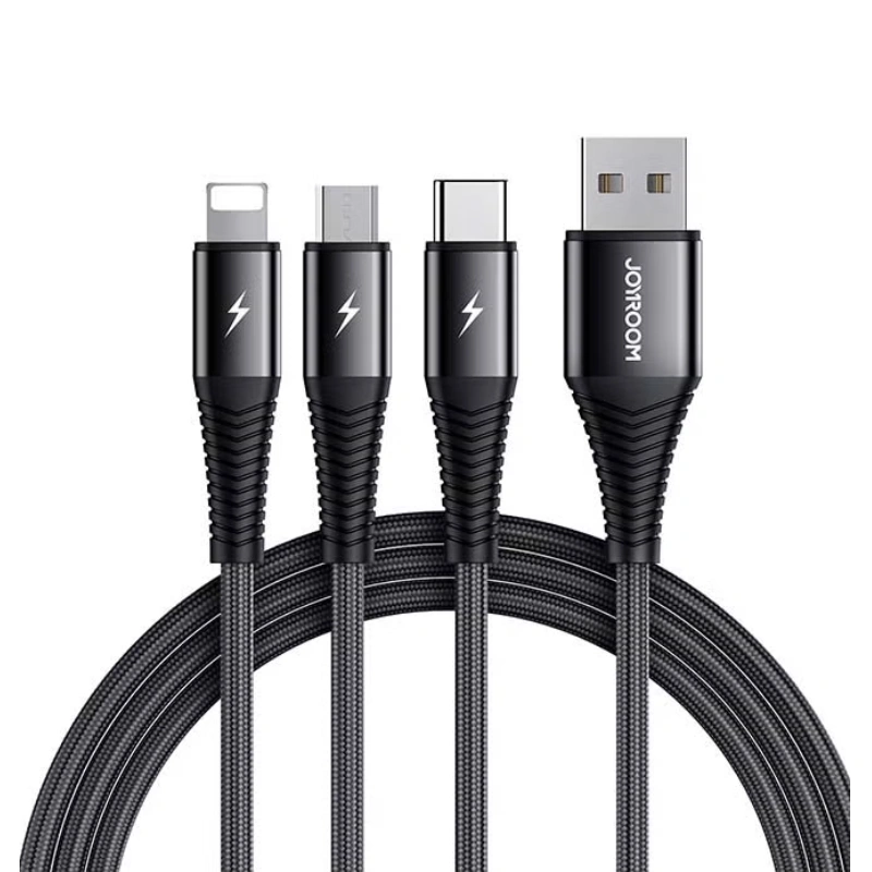 Joyroom S-1230G4 3-in-1 Fast Charging Braided Cable (1.2m) – Lightning, Type-C & Micro USB – 2.4A – Black